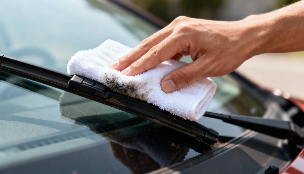Você notará que o pano sairá preto, indicando a remoção da fuligem e da borracha oxidada. Repita o processo até que o pano saia limpo. Só essa etapa já resolve grande parte dos problemas de trepidação e falhas na limpeza do para-brisa.